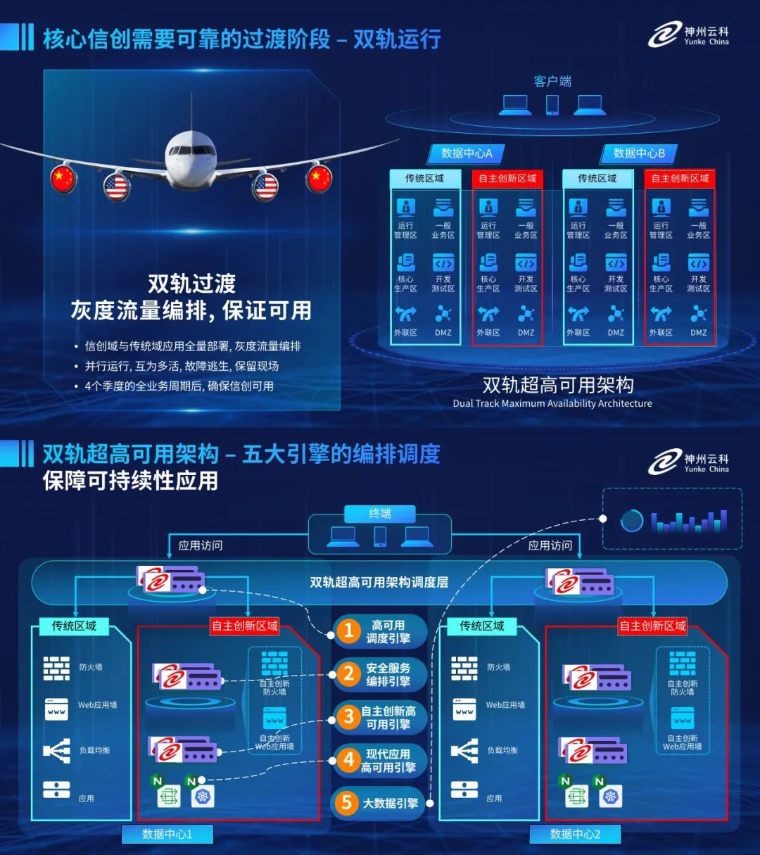 为助力金融业务高质量发展,更好地应对数字经济时代对可持续性的高要求,实现“信创”与“数字化”齐头并进,神州金沙js创新性的推出了核心信创·双轨过渡的超高可用架构。该架构在双活数据中心的分区调度基础上,增加信创域和非信创域的分域调度,实行信创域与传统域应用全量部署,使双中心运营变为双中心四区域并行运行,互为多活,将“0到1”的单轨建设道路变为分区分域协同的多活双轨超高可用架构。帮助客户在新架构下,保障“信创”的同时解决性能瓶颈,提升稳定性,保证应用可持续性,最终实现信创区域和非信创区域的平滑过渡,完成国产化替代目标。